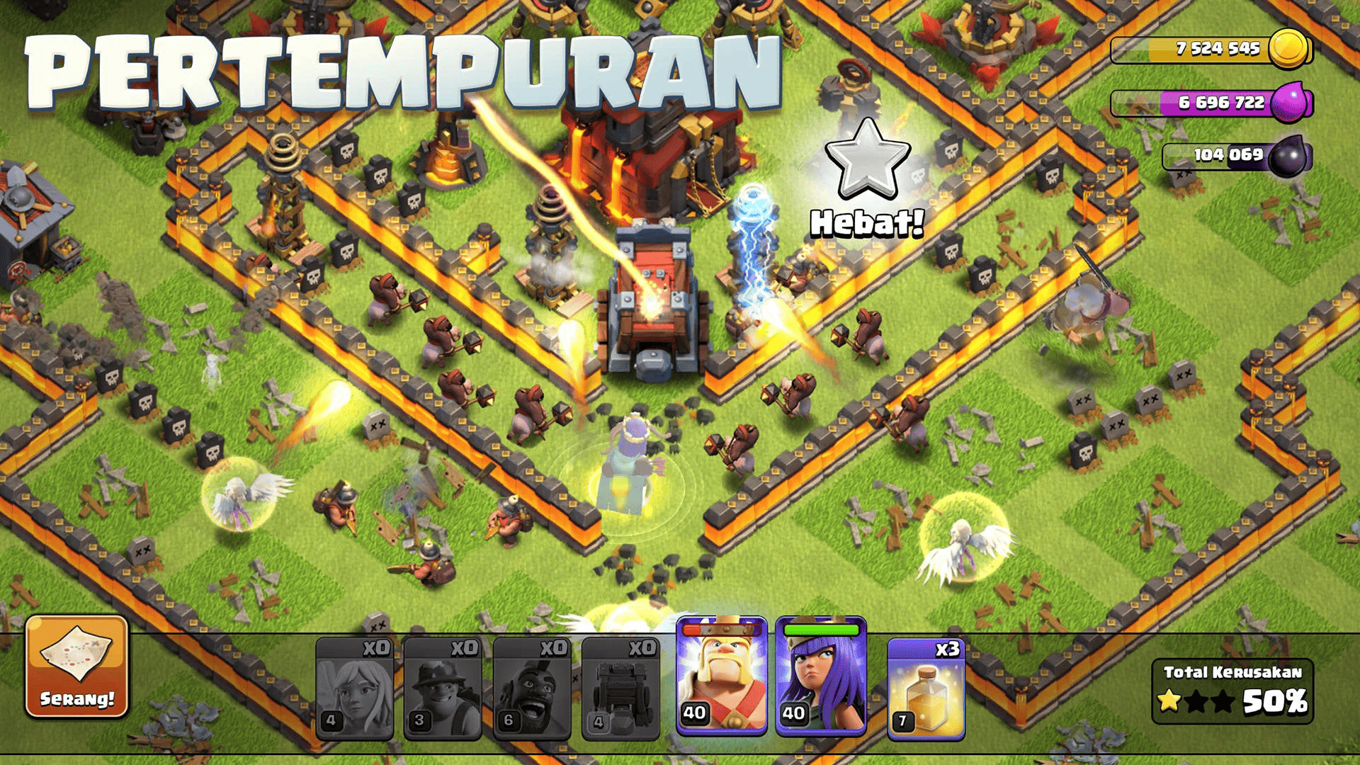 • Latih Pasukan: Pemain dapat melatih berbagai jenis pasukan seperti Barbarian, Archer, Wizard, dan lainnya untuk menyerang desa musuh